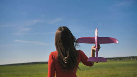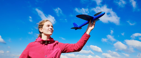 Girl playing with airplane. blue sky background. Travel and vacation concept