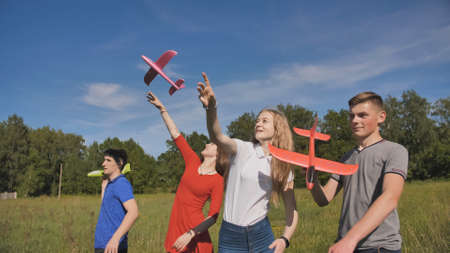 Teenage boy throwing blue airplane to the sky on summer sunny day. Childhood dreams, summer holiday entertainment outdoors