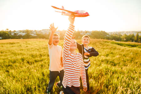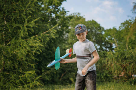Boy throws a toy airplane in the summer at sunset. A child plays with a toy airplane, dreams of a trip. Son plays by plane in the field at sunset. Have fun and enjoy life