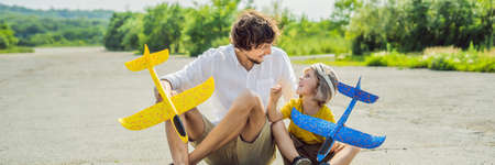 Happy father and son playing with toy airplane against old runway background. Traveling with kids concept.