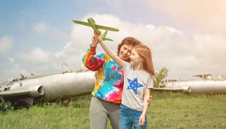 Mom and daughter are hugging at sunset. Happy family. The kid dreams of becoming an astronaut pilot. Childhood dream to run with a toy. Pilot of a children's plane. Dream concept