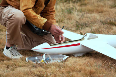 Glider pilot getting ready for the flight on motorless fixed-wing aircraft. Small aviation extreme sport leisure activity. Man near the plane in soaring club