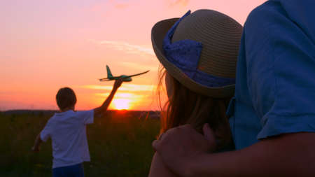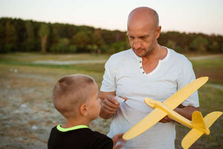 Soft focus of father and son playing toy airplane in meadow at sunset with happy emotions. Family, vacation and travel concept. At sunset in summer they launch an airplane against background sky