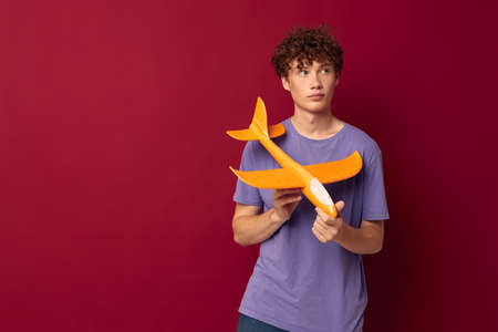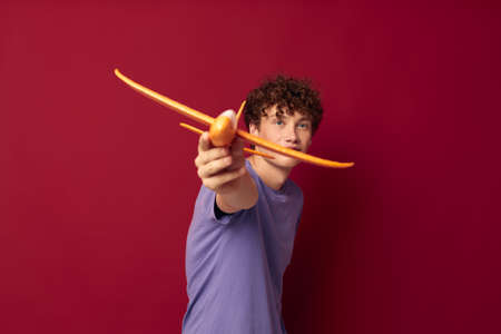 A young man with a toy plane in a purple t-shirt red background unaltered