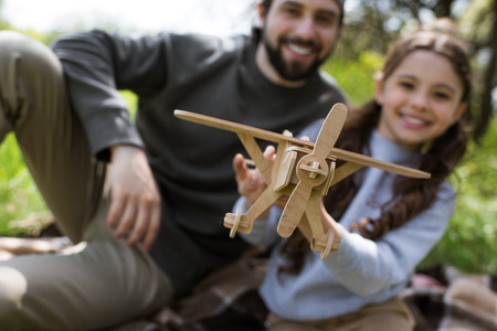 closeup view of wooden toy plane in hands of girl sitting on plaid with father in park