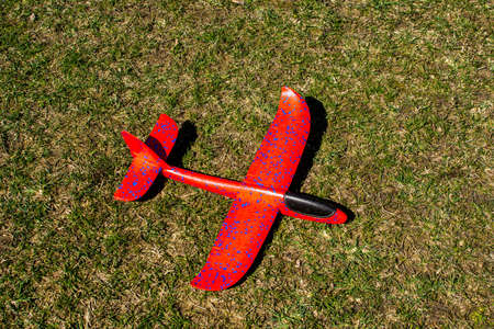 happy laughing girl in pink sportswear with red toy plane stay on green grass in summer on sunny day