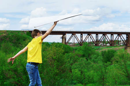 child plays with an airplane in nature. boy launches a paper plane. happy childhood, outdoor games