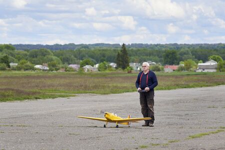 An elderly man launches a radio-controlled aircraft on the runway in the spring.