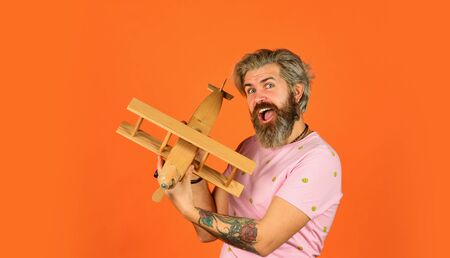 This is just beginning. Air travel. Transportation concept. Childhood dream. Aviator bearded hipster man. Wooden plane toy. Fly on airplane. Book tickets summer vacation. Play with plane. Cabin crew