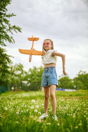 Cheerful happy girl launches a toy plane in a summer park. Full length portrait. Happy childhood. Summer holidays.