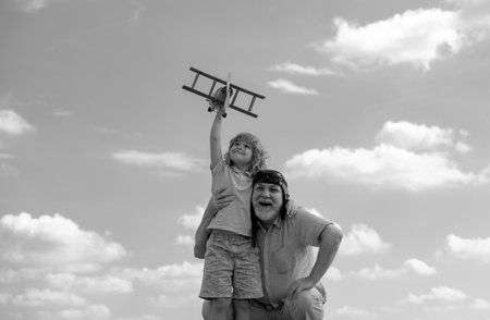 Child boy and grandfather playing with wooden plane against summer sky background. Child boy with dreams of flying or traveling. Family Relationship Grandfather and child.