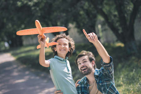 Toy plane. Happy dark-haired boy holding a toy plane, his father pointing to the sky