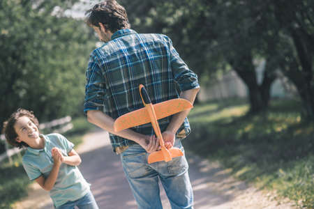 Surprise. Father holding a toy plane behind his back, a boy feeling excited