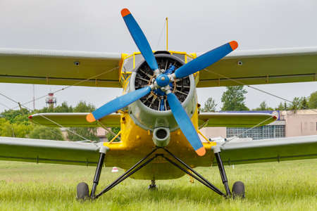 Soviet aircraft biplane Antonov AN-2 with blue four blade propeller and yellow fuselage parked on a green grass of airfield closeup