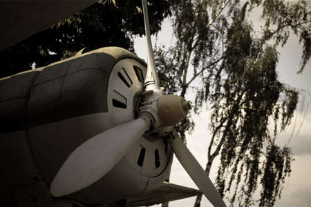 Engine and propeller of the old retro transport plane close-up. Fragment of the aircraft.