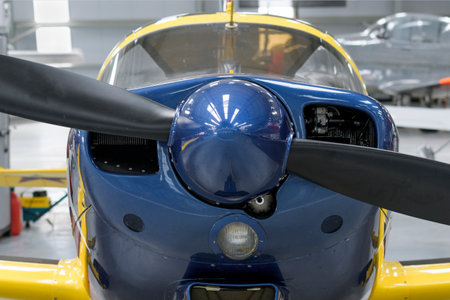 Small Sport Aircraft parked in hangar, close up. detail view of front, nose, cowling and propeller, piston aircraft
