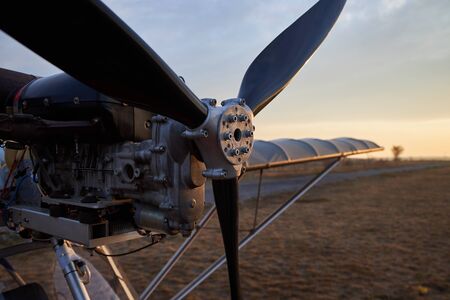 Propeller and internal combustion engine of an ultralight aircraft, close-up.
