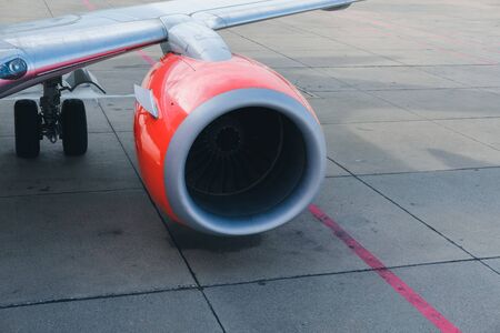 Aerial view of the turbine of a modern airplane. Drone photography.