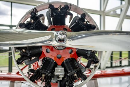 BERLIN, GERMANY - APRIL 25, 2018: Radial engine Wright R-1820-9 of the military trainer aircraft North American T-28B Trojan, close-up. United States Navy. Exhibition ILA Berlin Air Show 2018.