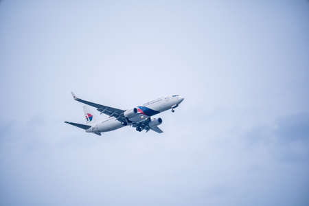 Bangkok, Thailand - May 4, 2018: Malaysia airbus approaches runway for a landing at Suvarnabhumi International Airport, Bangkok, Thailand.