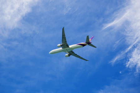 Phuket - Thailand - October 23,2017 : Thai airways airplane ,Boeing 777 is landing at Phuket airport over the Mai Khao beach in Thailand.