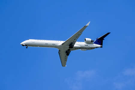 Victoria, Vancouver Island, British Columbia, Canada - August 25, 2021: Commercial Airliner airplane landing at the Airport during a sunny summer day.