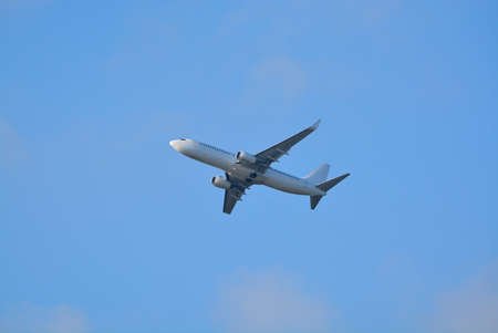 Big white airplane is the air, blue sky, cargo transportation or business travel, sunny day