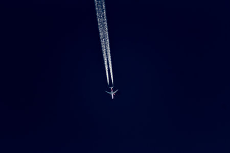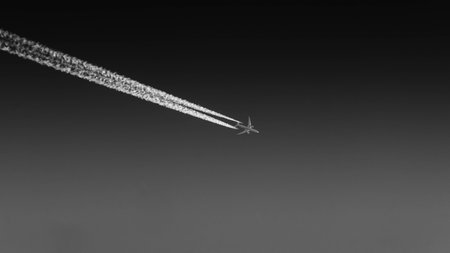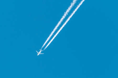 Passenger airplane flies high in the sky, leaving a long white trail behind, symbolizing travel and air transportation