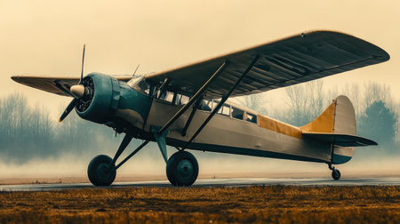 A stunning vintage bi-plane rests on a fog-laden runway, highlighting the beauty of early aviation designs, set against a moody, atmospheric backdrop.