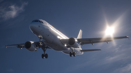 A large commercial airplane flying through a clear blue sky with the sun shining brightly