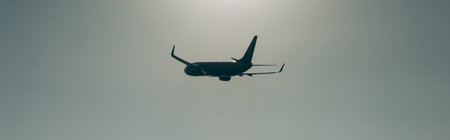 Silhouette of plane in grey sky. Passenger plane flies high in sky, flight. International flights, delivery, transportation. Flight and weather conditions concept.