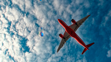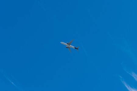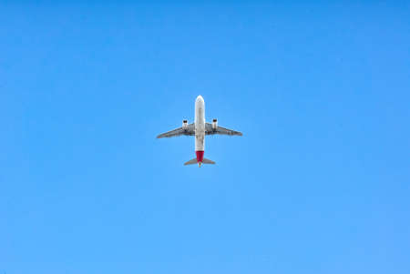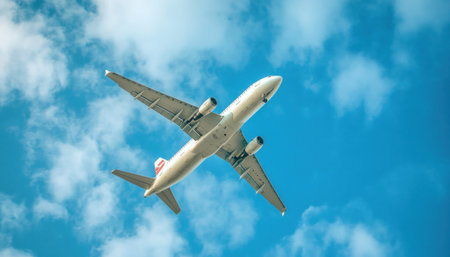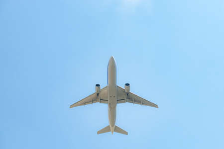Commercial airline flying on blue sky and white fluffy clouds. Under view of airplane flying. Passenger plane after take off or going to landing flight. Vacation travel abroad. Air transportation.