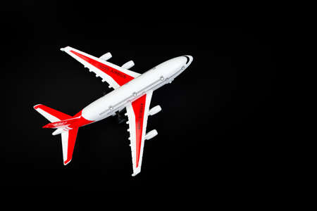 plastic model airplane with red wings against a dark background. tourism and travel concept.