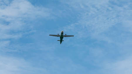 View of propeller plane fly low with blue sky and clouds at background. Commercial passenger aircraft across flying over head. Plane in the air. Flight trip