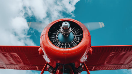 A close-up of a vintage red biplane engine against a cloud-filled sky