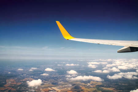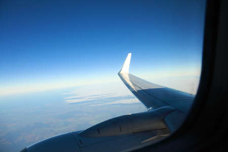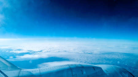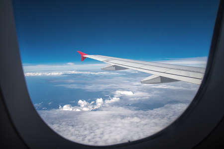 Adventure, travel, transport concept. View from plane window at sky with clouds and wing