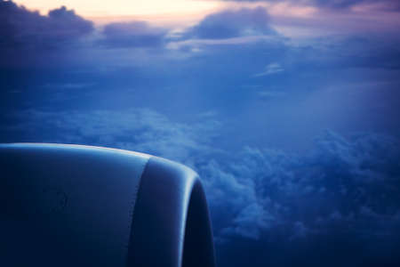 View from airplane window on sunrise sky in blue tones