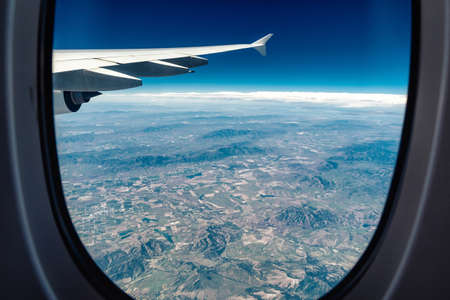 View of the mountains from the airplane porthole. Travel concept