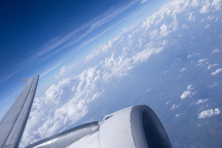 Airplane in the blue sky engine and wings white clouds