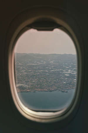 View from the airplane window on the city from the porthole