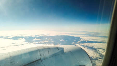 View from airplane window, Top view from airplane, Clouds on the sky and view from airplane window.