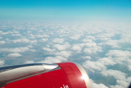 View from the porthole on the wing of an airplane flying to Cyprus with a red aircraft engine, in the early morning over beautiful white clouds.