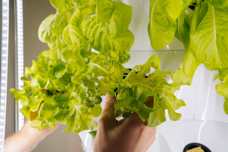 Indoor Planting Salad Vegetables with Hydroponic System and artificial sunlight from electricity cabinet, idea for Farming Innovation inside of residential, side view and vertical