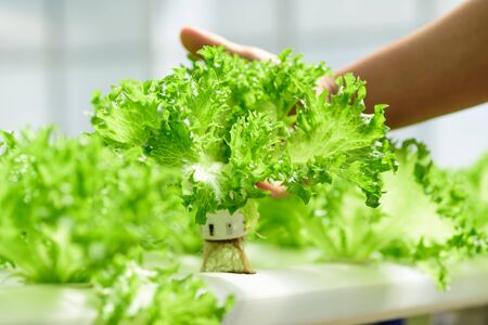 Hydroponic vegetable in farm. Lettuce in hand.
