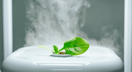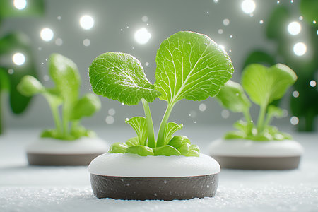Green seedlings growing in a misty environment with bubbles.