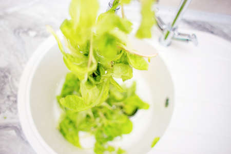 The process of washing green salad leaves in the home kitchen in the sink. Summer vitamins