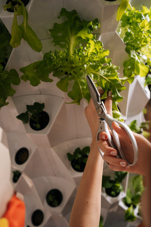 Close-up cropped shot of female hands using scissors, harvesting fresh lettuce growing in modern vertical hydroponic farm, showcasing sustainable agriculture and innovative food production techniques.