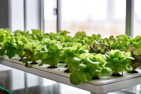 Fresh organic leafy greens growing in agricultural greenhouse.