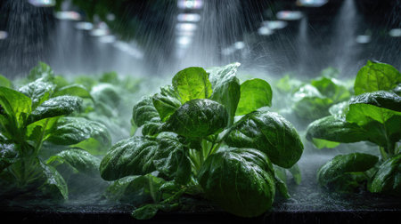 Close-up view of vibrant green leafy vegetables thriving in a hydroponic system, enhanced by water mist in a controlled agricultural environment.