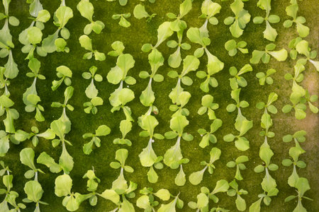 Top view of fresh green lettuce salad growing in hydroponic farm